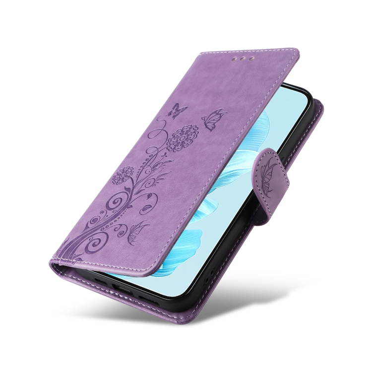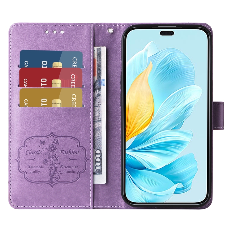 Funda de Cuero Honor 200 Lite Diseño Mariposas y Flores en Relieve (Morado)