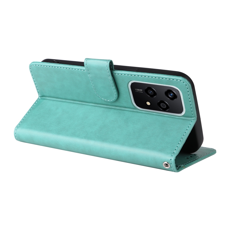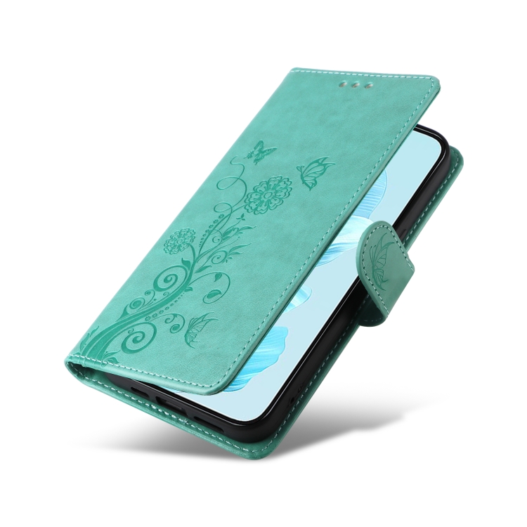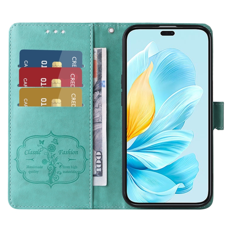 Funda de Cuero Honor 200 Lite con Diseño de Mariposas y Flores en Relieve (Verde)