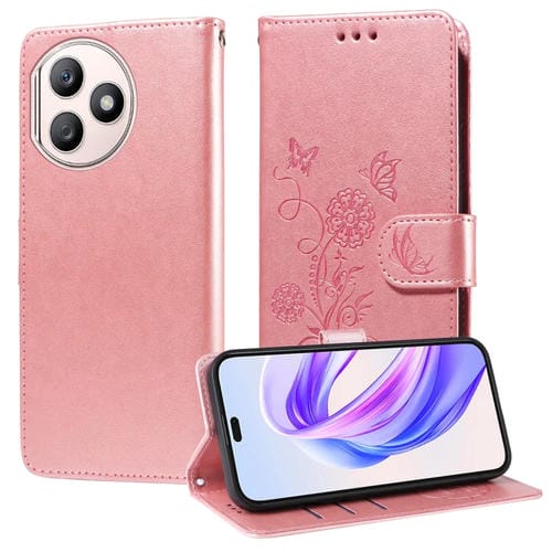 Funda de Cuero para Honor X50I+ con Diseño de Mariposas y Flores en Relieve (Oro Rosa)