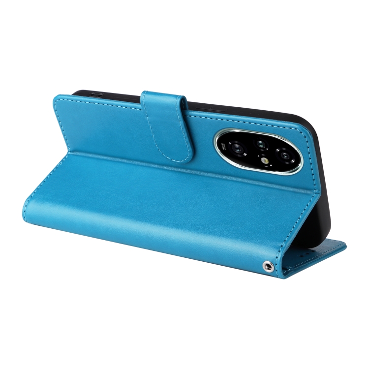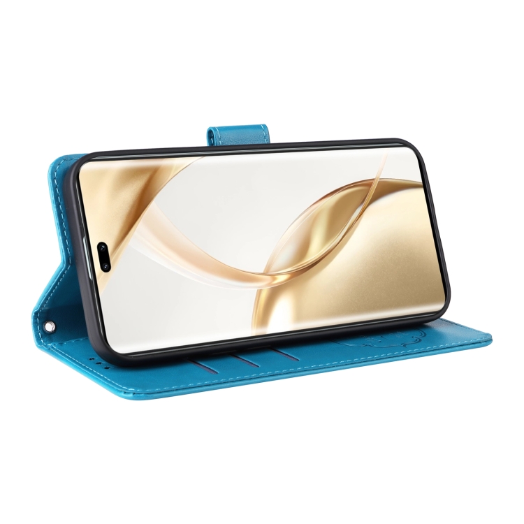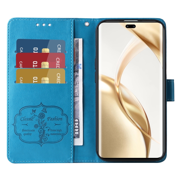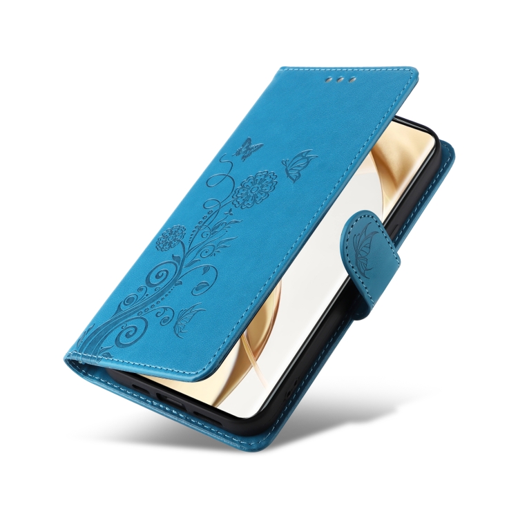 Funda de Cuero Honor 200 Pro con Diseño de Mariposas y Flores en Relieve (Azul)