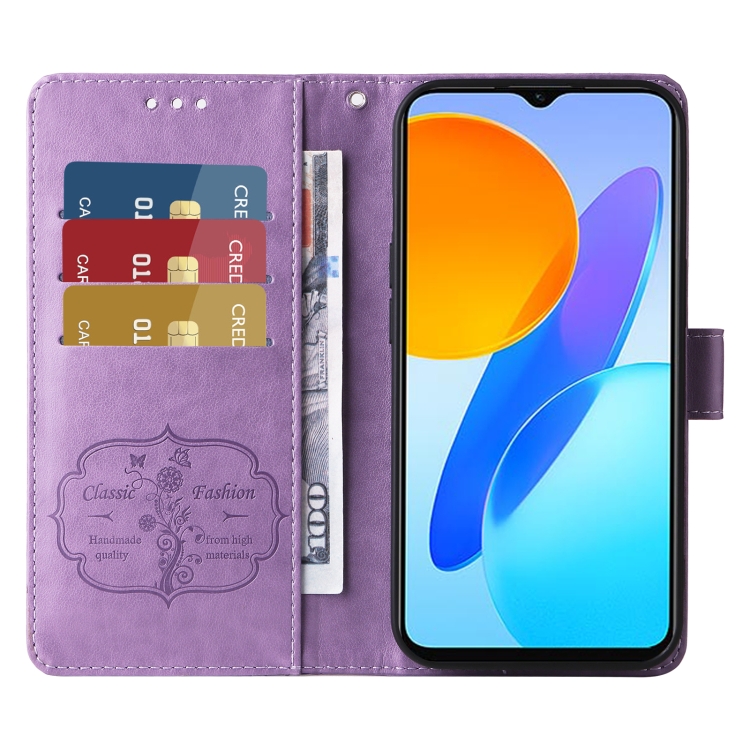 Funda de Cuero Honor Play 6C/X6S/70 Lite con Diseño de Mariposas y Flores en Relieve (Morado)