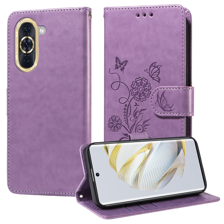 Funda de Cuero para Huawei Nova 10 con Diseño de Mariposas y Flores en Relieve (Morado)