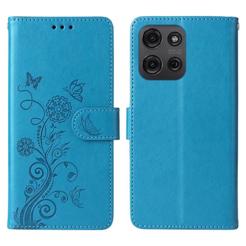 Funda de Cuero Motorola Moto G75 5G con Diseño de Mariposas y Flores en Relieve (Azul)