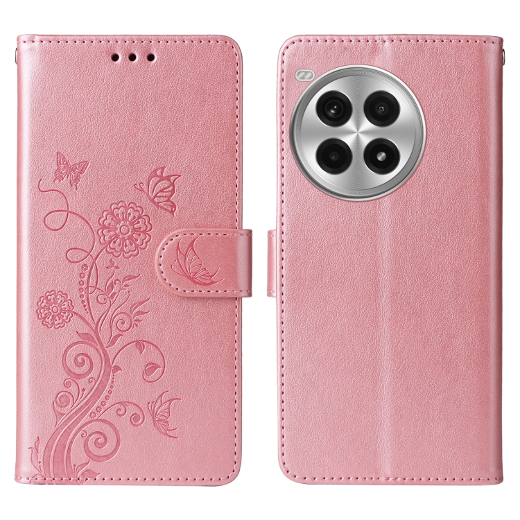 Funda de Cuero OnePlus Ace 3 Pro 5G con Diseño Mariposas y Flores en Relieve (Oro Rosa)