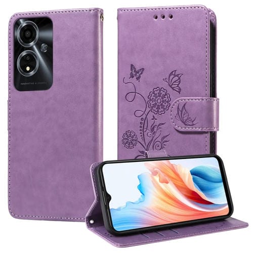 Funda de Cuero con Diseño de Mariposas y Flores En Relieve para Oppo A59 5G (Morado)