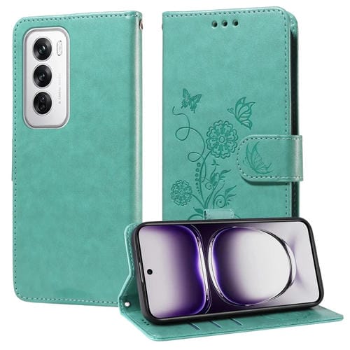 Funda de Cuero con Diseño de Mariposas y Flores En Relieve para Oppo Reno12 5G (Verde)