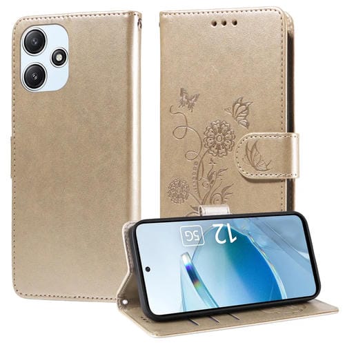 Funda de Cuero con Diseño de Mariposas y Flores En Relieve para Redmi 12 5G/4G/Note 12R (Dorada)