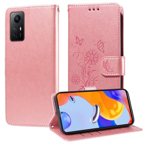 Funda de Cuero con Diseño de Mariposas y Flores En Relieve para Redmi Note 12S 4G (Oro Rosa)