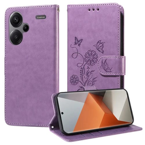 Funda de Cuero con Diseño de Mariposas y Flores En Relieve para Redmi Note 13 Pro+ 5G (Morado)