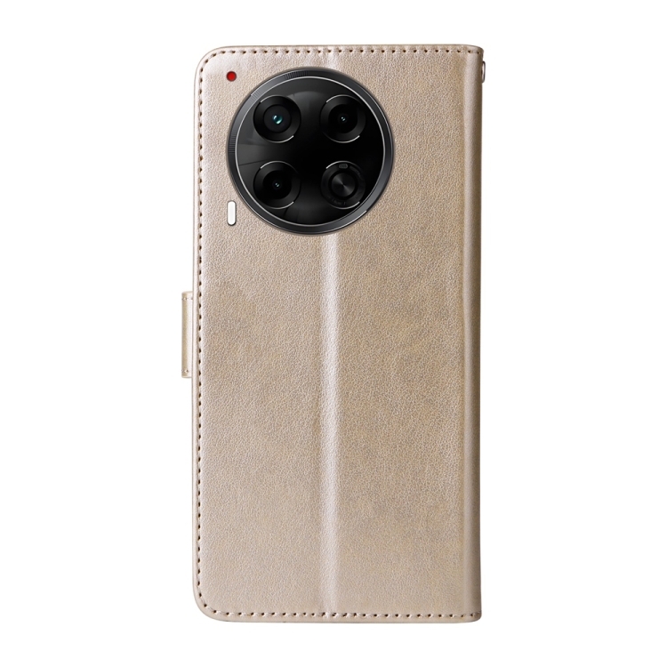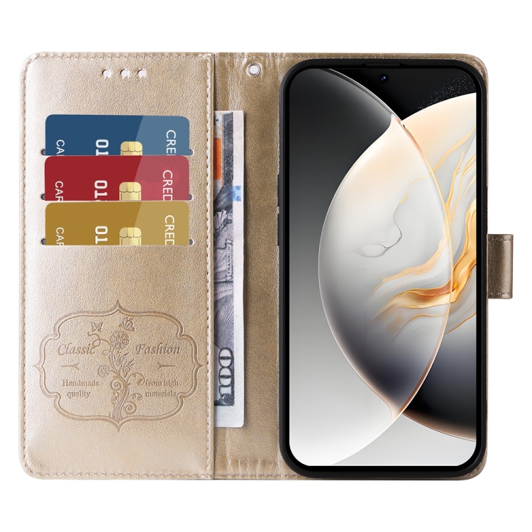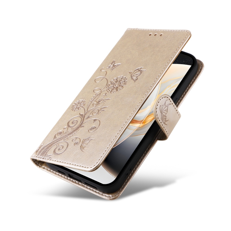 Funda de Cuero para Tecno Camon 30S y 30S Pro con Diseño de Mariposas y Flores en Relieve (Dorada)