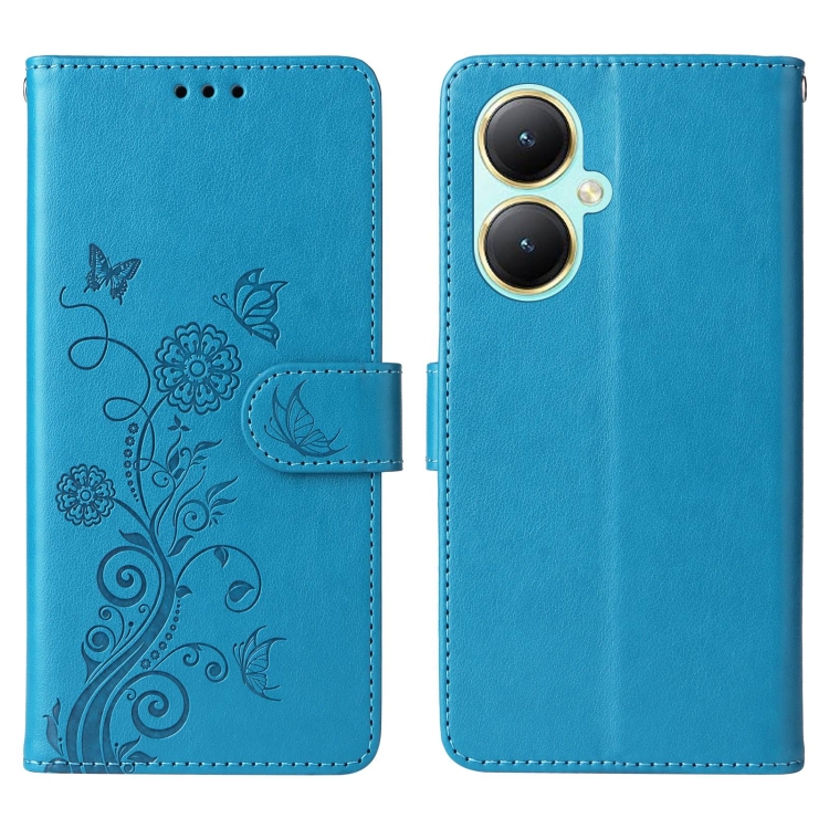 Funda de Cuero con Diseño de Mariposas y Flores En Relieve para Vivo Y35M+ / Y35+ / Y27 4G (Azul)