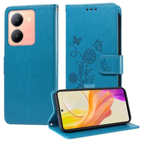Funda de Cuero con Diseño de Mariposas y Flores En Relieve para Vivo Y36 4G/5G (Azul)