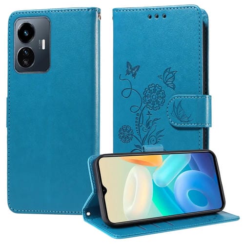 Funda de Cuero con Diseño de Mariposas y Flores En Relieve para Vivo Y77 5G (Azul)