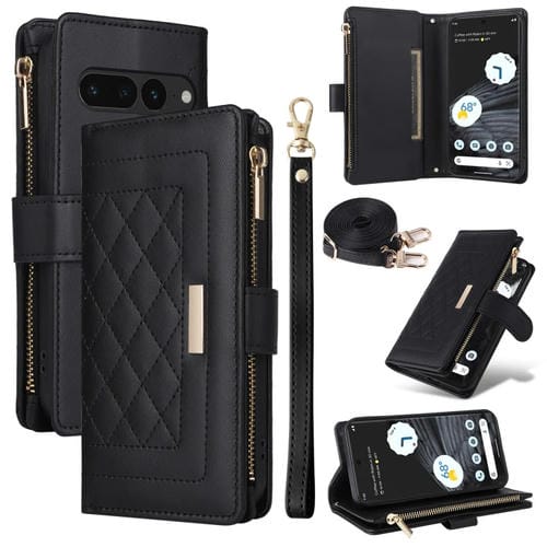 Funda de Cuero con Diseño de Rombos y Billetera Cruzada con Cremallera para Google Pixel 7 Pro (Negra)