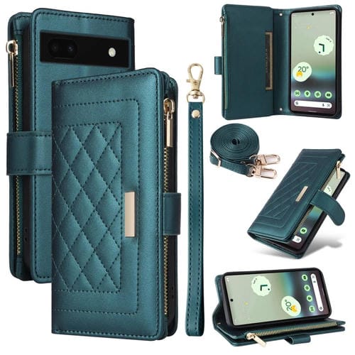 Funda de Cuero con Diseño de Rombos y Billetera Cruzada con Cremallera para Google Pixel 7A (Verde)