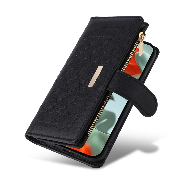 Funda de Cuero con Diseño de Rombos y Billetera Cruzada con Cremallera para Google Pixel 9 Pro XL (Negra)