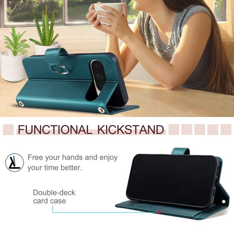 Funda de Cuero para Google Pixel 9 Pro XL con Diseño Rómbico y Hebilla de Anillo (Verde)
