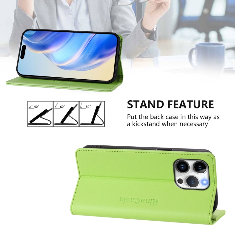 Funda de Cuero iPhone 15 Pro Max Rc01 Doble Pliegue Succión Magnética (Verde Hierba)