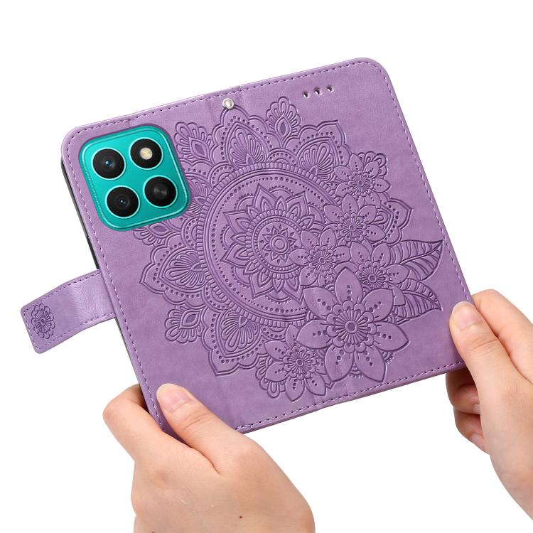 Funda de Cuero con Estampado de Flores de Siete Pétalos para Honor X8C 4G (Morado Claro)