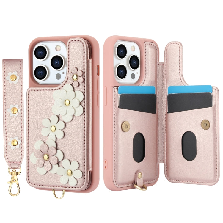 Funda de Cuero iPhone 14 Pro Estampado de Flores Diseño Cruzado (Oro Rosa)