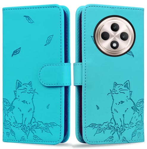 Funda de Cuero con Estampado de Gato para Oppo Reno12 F 5G (Azul Lago)