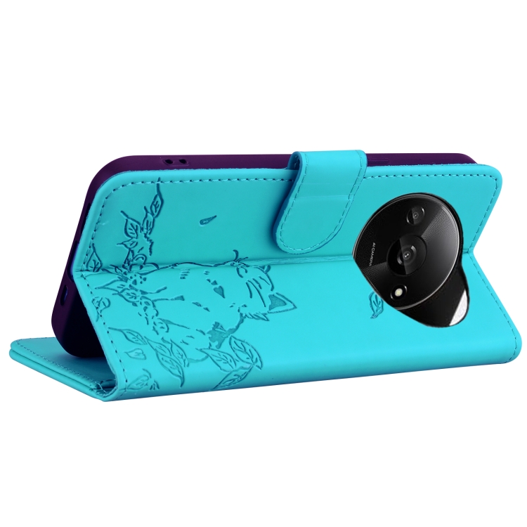 Funda de Cuero con Estampado de Gato para Redmi A3 (Azul Lago)