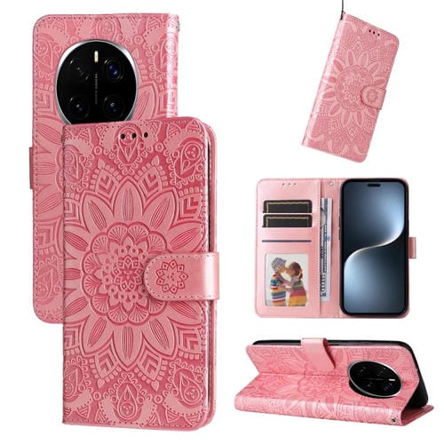 Funda de Cuero Honor Magic7 Pro con Estampado de Girasoles en Relieve (Oro Rosa)