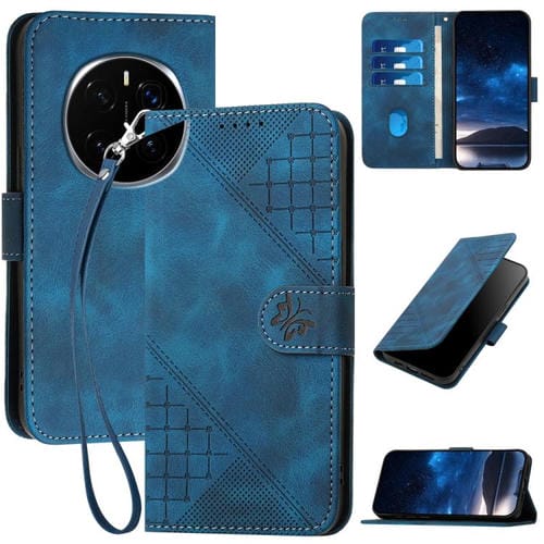 Funda de Cuero para Honor Magic7 con Estampado de Mariposas en Relieve y Cordón (Azul Oscuro)