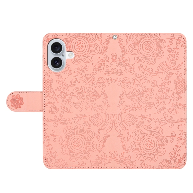 Funda de Cuero para iPhone 16 Estampado Floral en Relieve (Rosa)