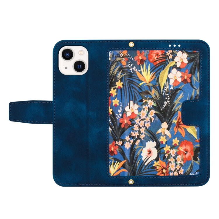 Funda de Cuero para iPhone 13 Mini Estampado Floral con Cordón (Azul Oscuro)