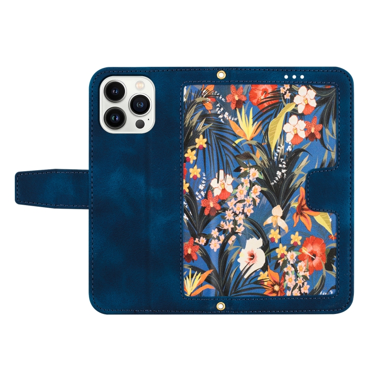 Funda de Cuero para iPhone 16 Pro Estampado Floral con Cordón (Azul Oscuro)
