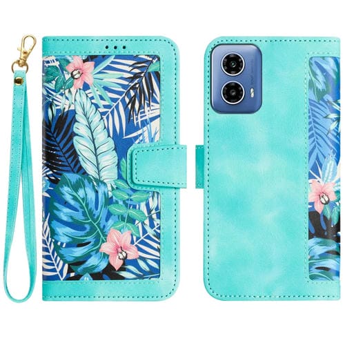 Funda de Cuero Motorola Moto G34 con Estampado Floral y Cordón (Verde)