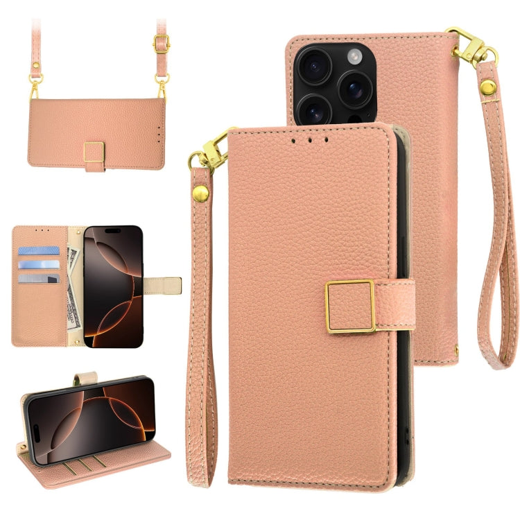Funda de Cuero con Hebilla Cuadrada y Textura de Lichi para iPhone 16 Pro Max (Oro Rosa)