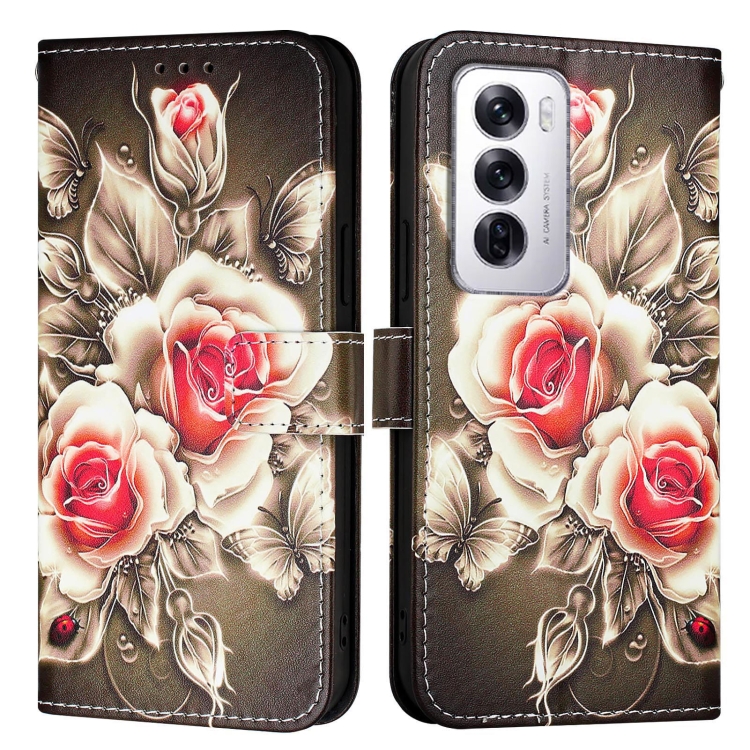 Funda de Cuero con Patrón de Dibujo de Colores para Oppo Reno12 Global (Rosas Sobre Negro)