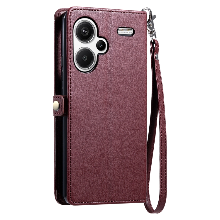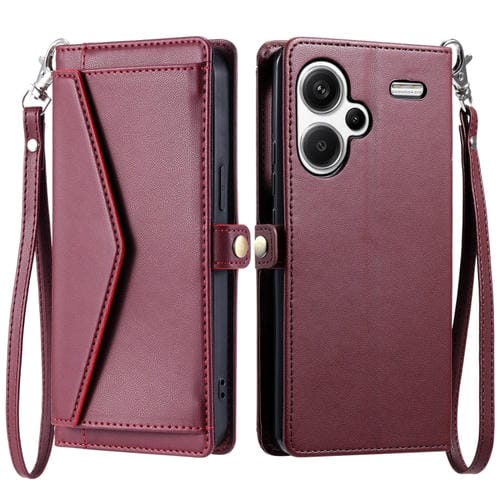 Funda de Cuero con Ranura para Múltiples Tarjetas y Cordón para Redmi Note 13 Pro+ 5G Global Wallet (Rojo Vino)