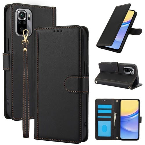 Funda de Cuero con Ranuras para Tarjetas y Diseño de Piel Sintética de Color Puro para Redmi Note 10 4G/Note 10S 4G con Cordón Doble (Negro)