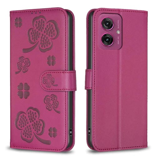 Funda de Cuero con Relieve de Cuatro Hojas para Motorola Moto G55 (Rosa rojo)