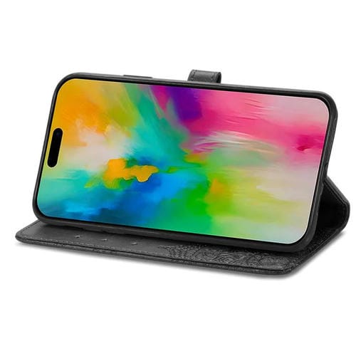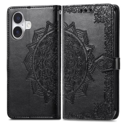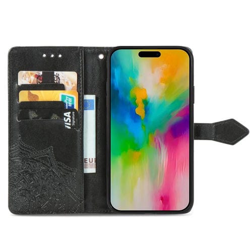 Funda de cuero con relieve de flor de mandala para iPhone 17 (negra)