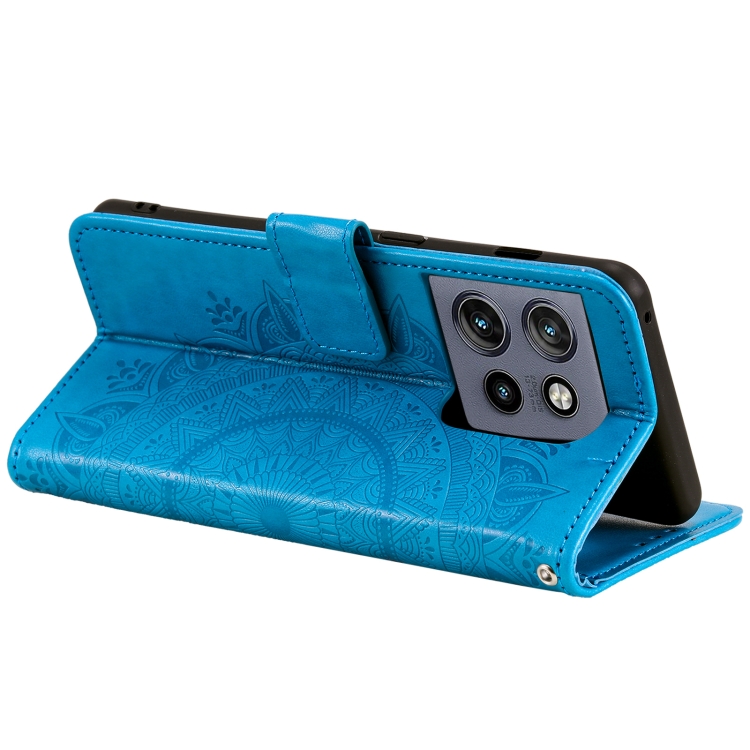 Funda de Cuero con Relieve de Flor de Tótem para Motorola Edge 50 Neo con Cordón (Azul)