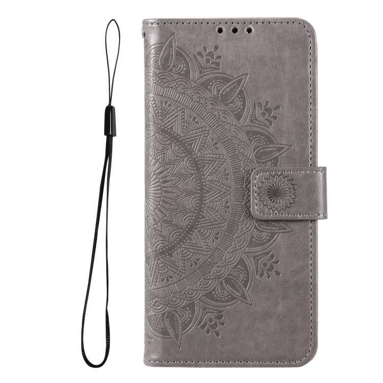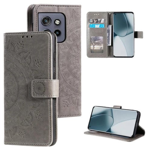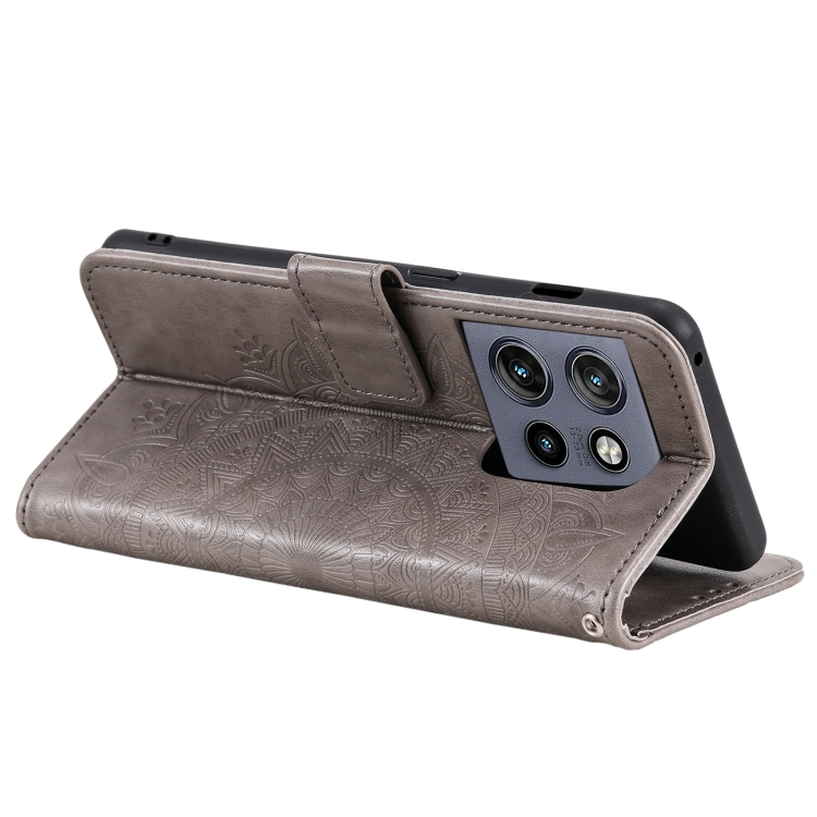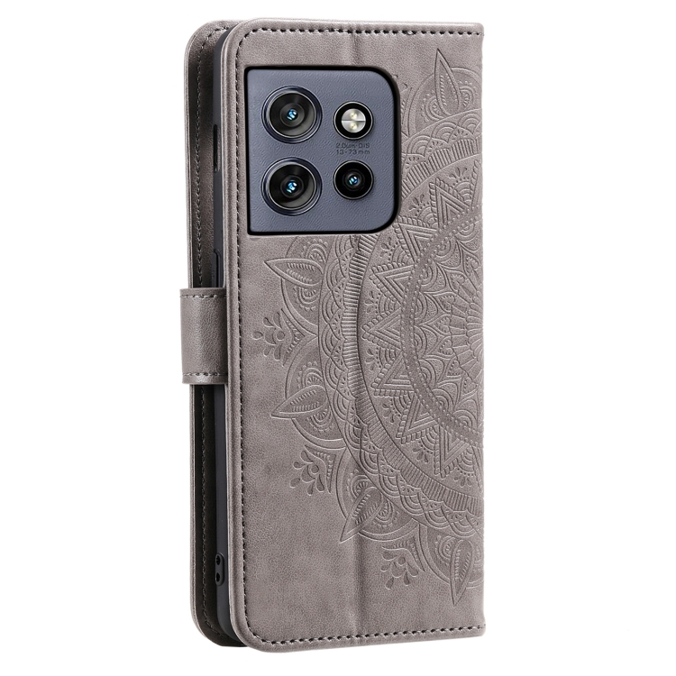 Funda de Cuero con Relieve de Flor de Tótem para Motorola Edge 50 Neo con Cordón (Gris)