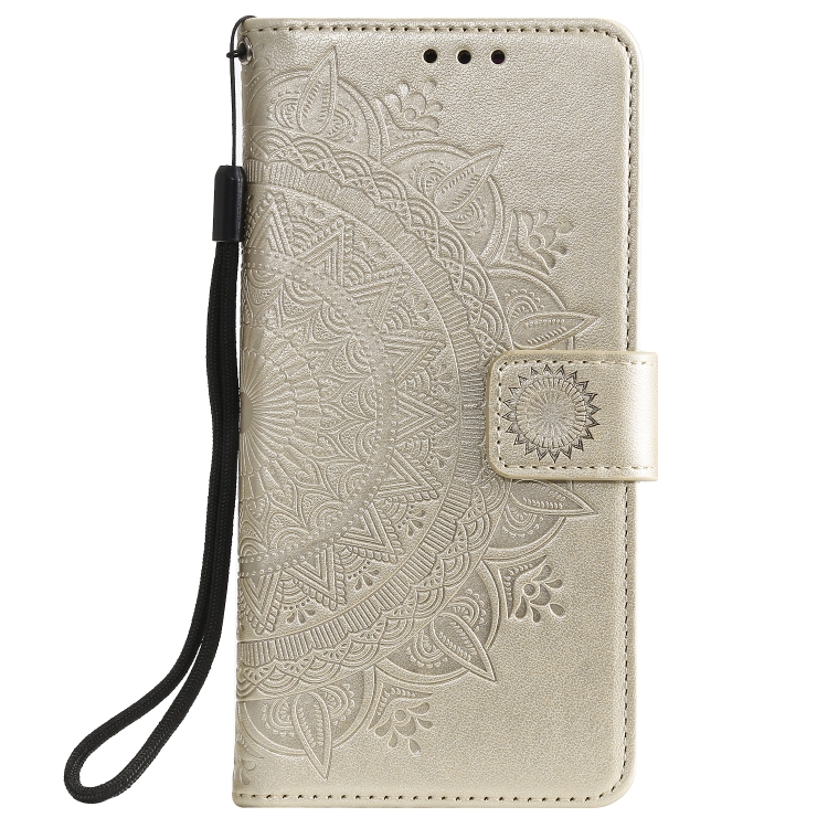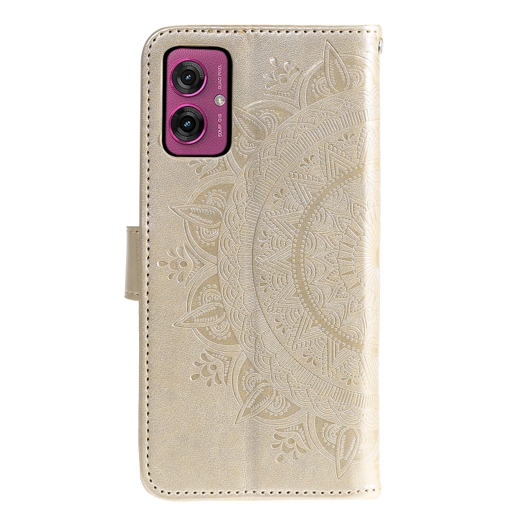 Funda de Cuero con Relieve Flor de Tótem para Motorola Moto G55 con Cordón (Dorado)