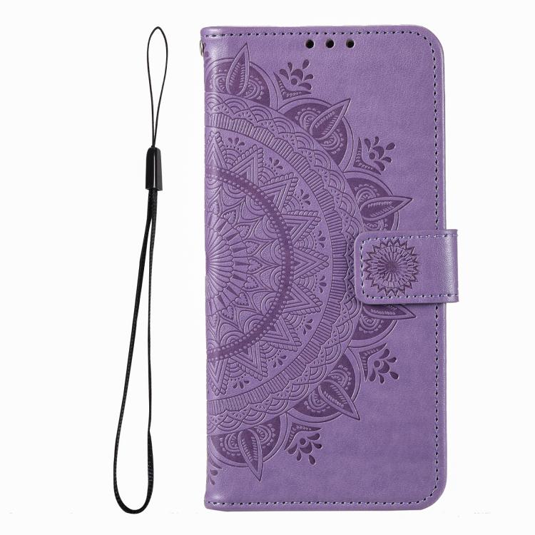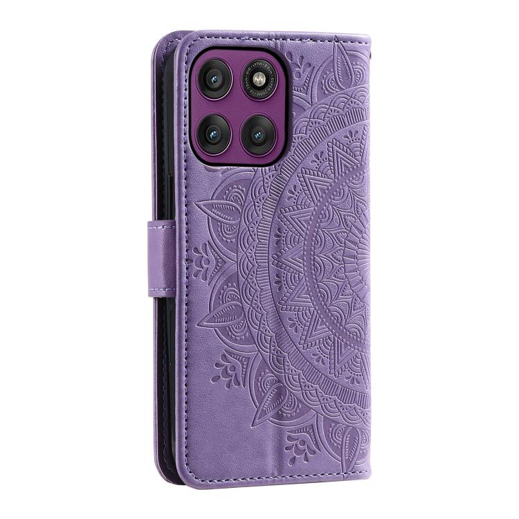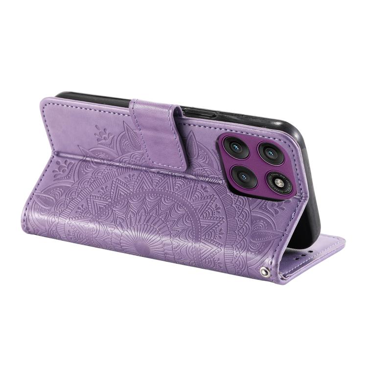 Funda de cuero con relieve de flor tótem y cordón para Motorola Edge 60 Pro (morado)