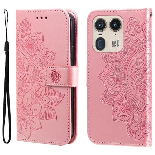 Funda de Cuero con Relieve de Flores de Siete Pétalos para Motorola Edge 50 Ultra/X50 Ultra (Oro Rosa)