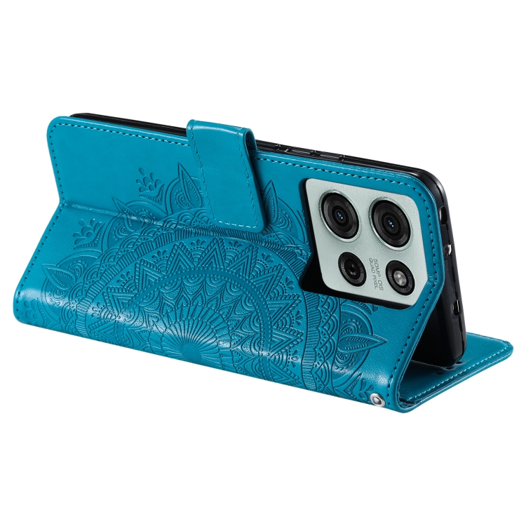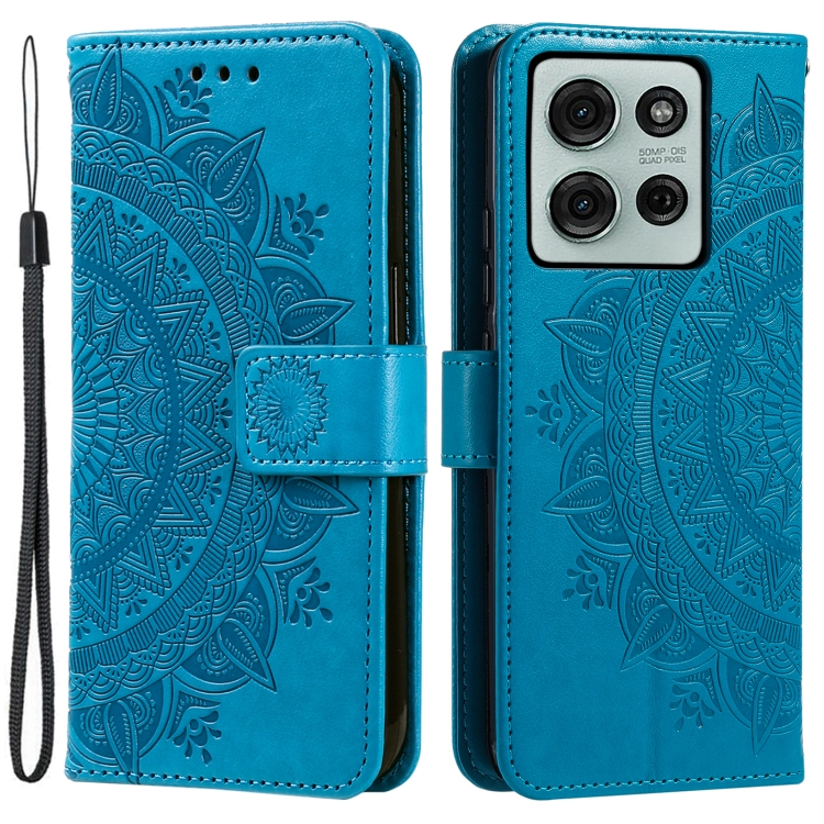 Funda de Cuero con Relieve de Flores para Motorola Moto G75 5G con Cordón (Azul)