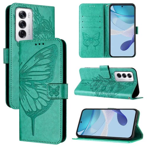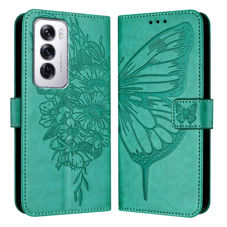 Funda de Cuero con Relieve de Mariposa para Teléfono Oppo Reno12 5G Global (Verde)
