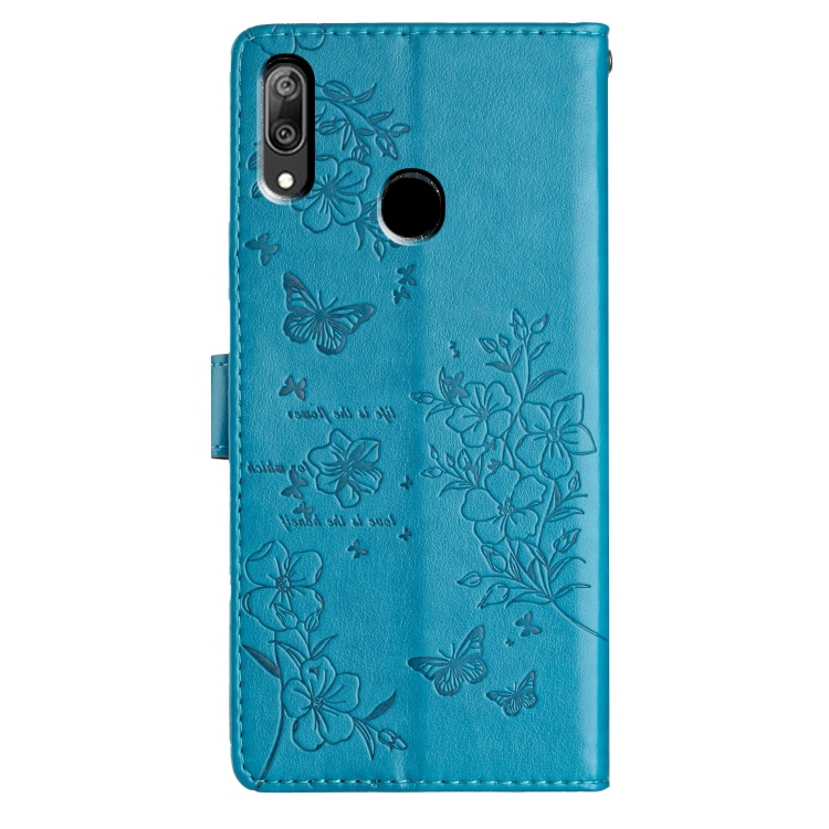 Funda de Cuero con Relieve Mariposa y Flor para Huawei Y7 2019 (Azul)