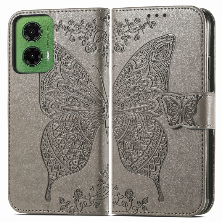 Funda de Cuero con Relieve de Mariposa y Flor para Motorola Moto G35 (Gris)