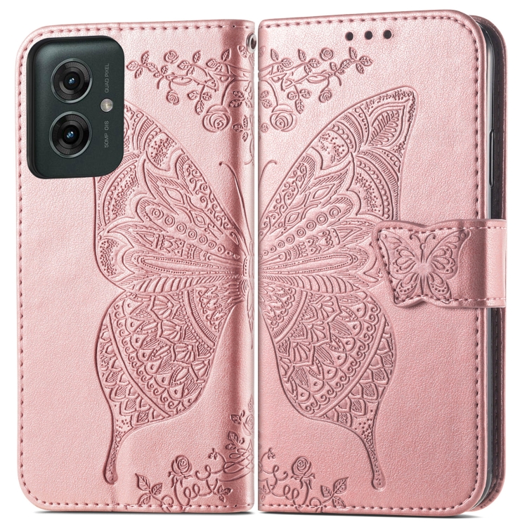 Funda de Cuero con Relieve Mariposa y Flor para Motorola Moto G55 (Rosa)