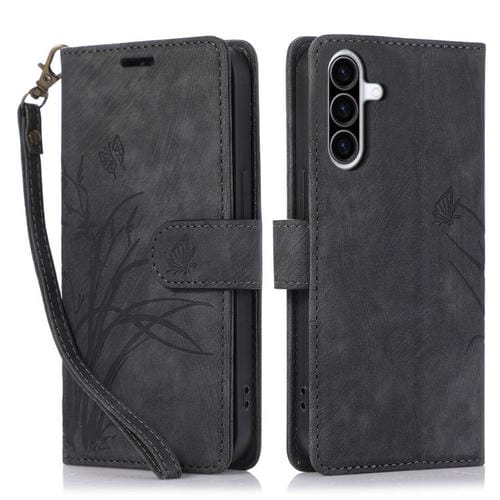 Funda de Cuero Samsung Galaxy A36 5G Relieve Mariposa y Orquídea (Negra)
