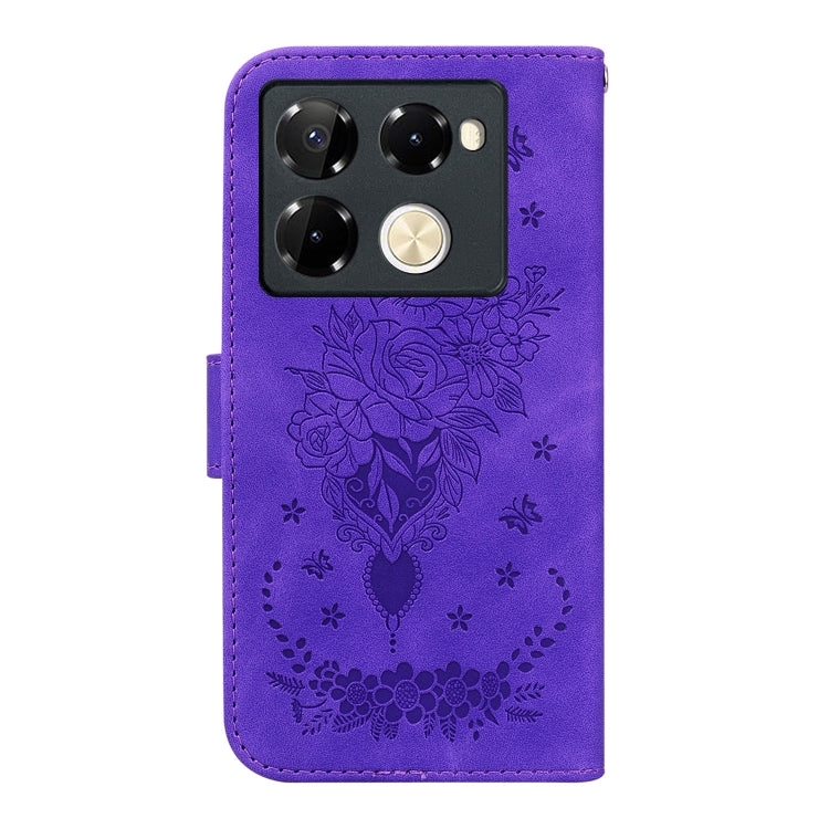 Funda de Cuero con Relieve Mariposa y Rosa para Infinix Note 40 Pro 4G/5G (Morado)